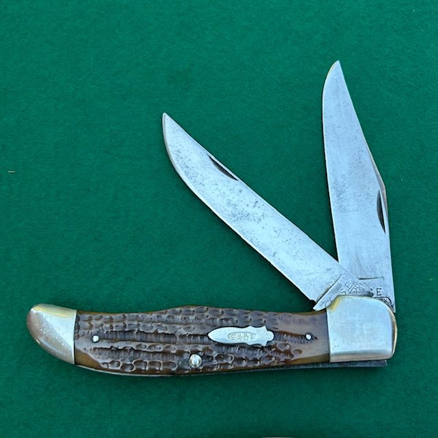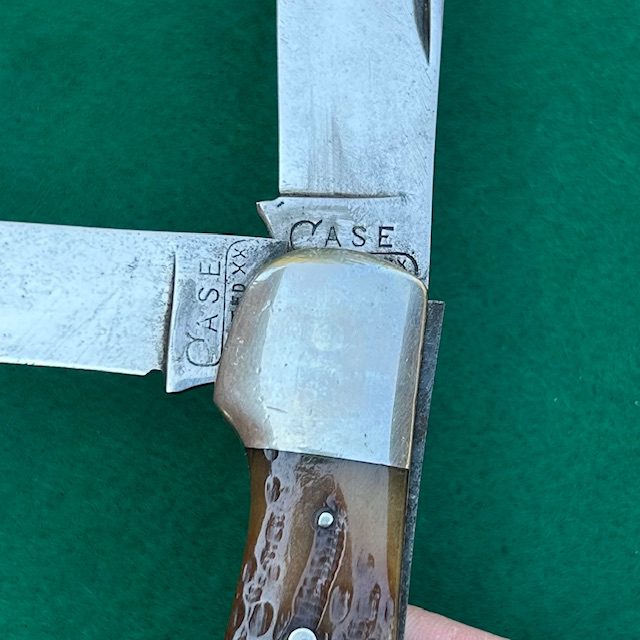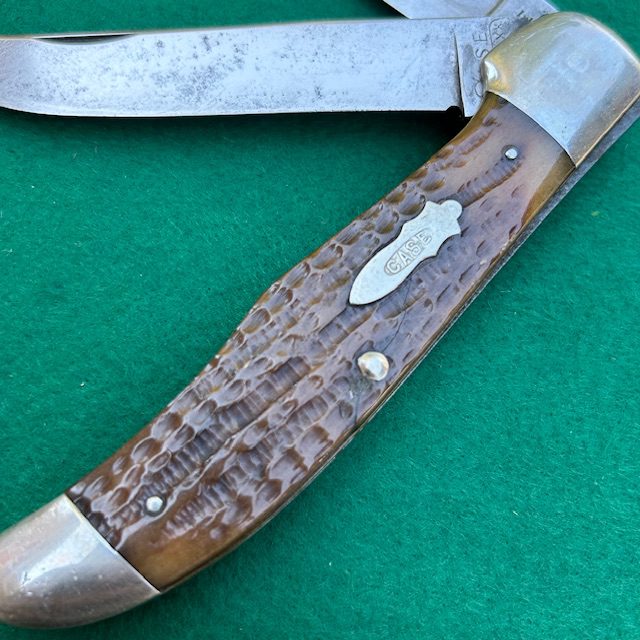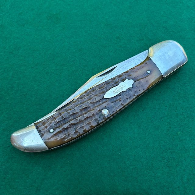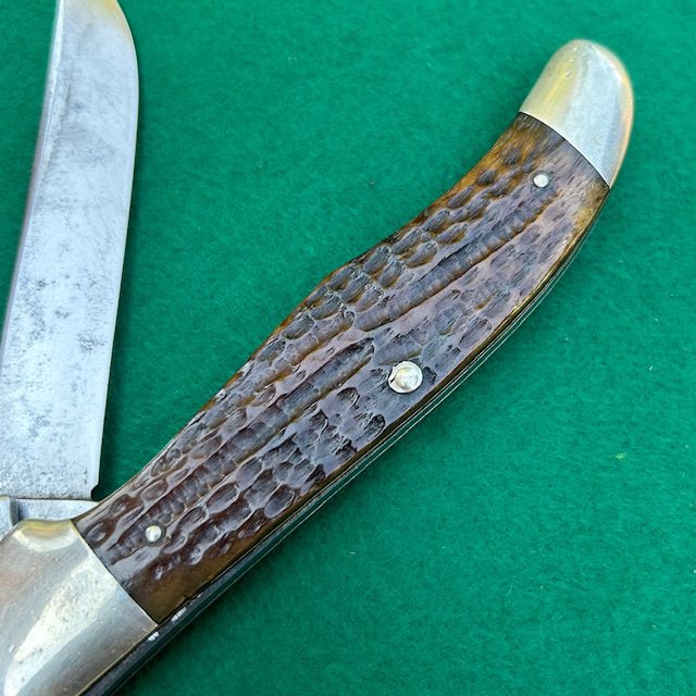 Here is a wonderful Case Tested XX (probably from the 1920’s) 6265 folding hunter with rare worm grooved green bone handles and rare bomb shield. Both blades have the Long Tail C stamp, have strong snap opening and closing and no wobble in open position. The knife measures 5 1/4″ closed. A small, stable hairline is present from the shield to the center pin and down as seen in the pictures. A great example of this rare and early pattern!