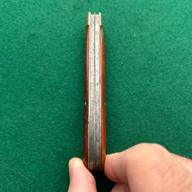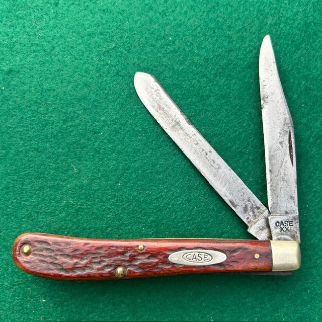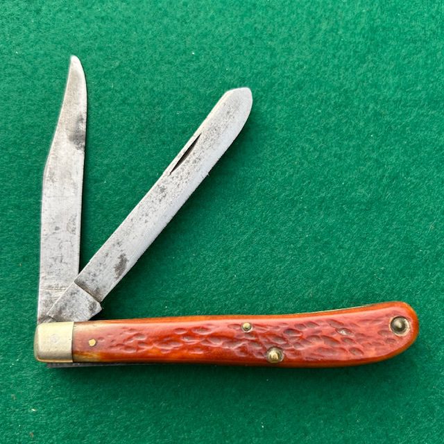Here is a Case XX Slimline trapper featuring reddish Rogers Bone handles. This knife was made from the period 1940 – 64. Both blades have good snap and show wear and use as seen in the pictures. Bone handles are in great, pocket worn condition. Really nice example!