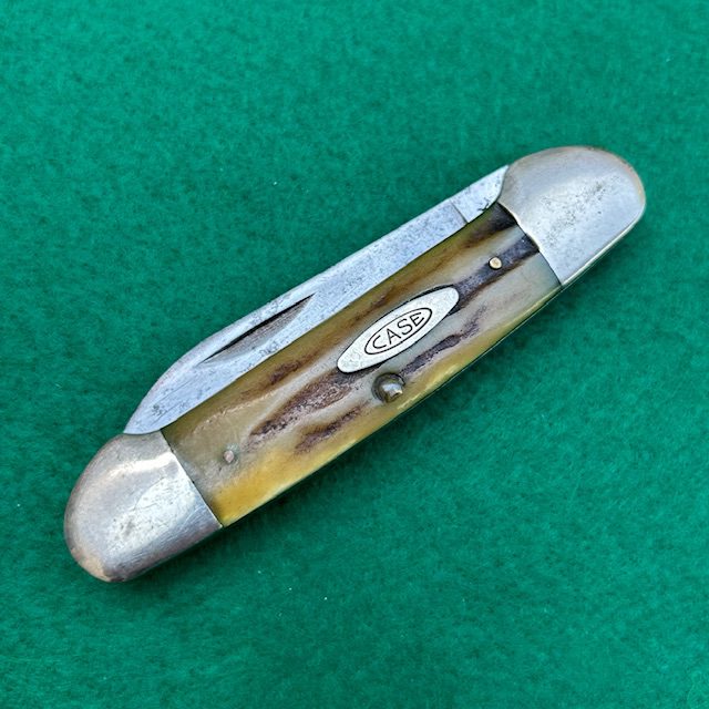 **SOLD** Up for sale is an old CASE XX USA canoe with beautiful genuine stag handles made between 1965 – 69. Measures 3 5/8″ closed. Both blades have good snap, are mostly full and show some use and tarnish as seen in the pictures. Nickel silver bolsters with brass liners and pins. A really nice example!