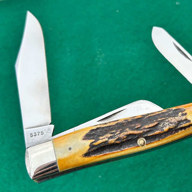 Here is a stunning Case XX USA 5375 jumbo stockman with genuine stag handles. Check out this YouTube video to get more view of this knife. The knife measures 4 1/4″ closed. The blades have factory edge, mirror polished surfaces and good snap. Nickel silver bolsters, brass liners and pins. A bit of blade rub on the sheepfoot and spay blade but this is very common. Really nice stag handles on this one…get it while it lasts!