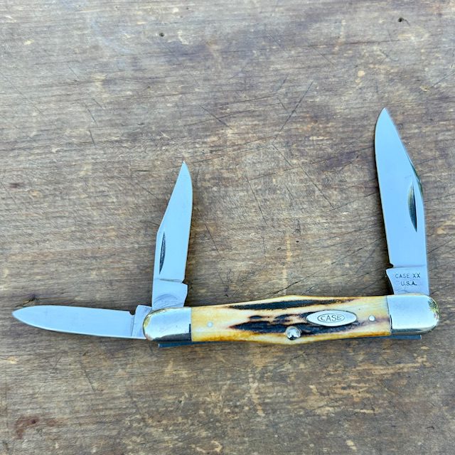 **SOLD** Up for sale is a beautiful Case XX USA 1965-1969 5383 balloon whittler with genuine stag handles. I made a YouTube Video featuring this knife. This pattern measures 3 1/2″ closed. Nickel silver bolsters and liners. Blades have good snap and factory edge. A couple tiny carbon spot on the rear bolster and tiny scratch near master nail nick but in wonderful shape! This is a great knife!