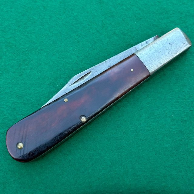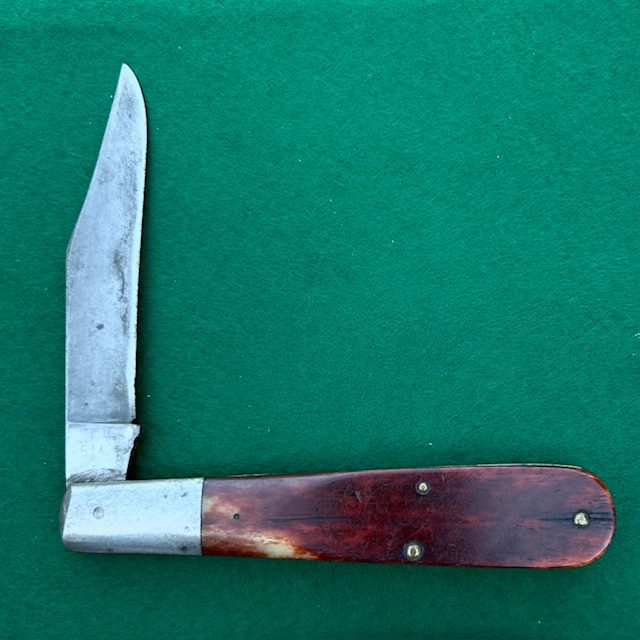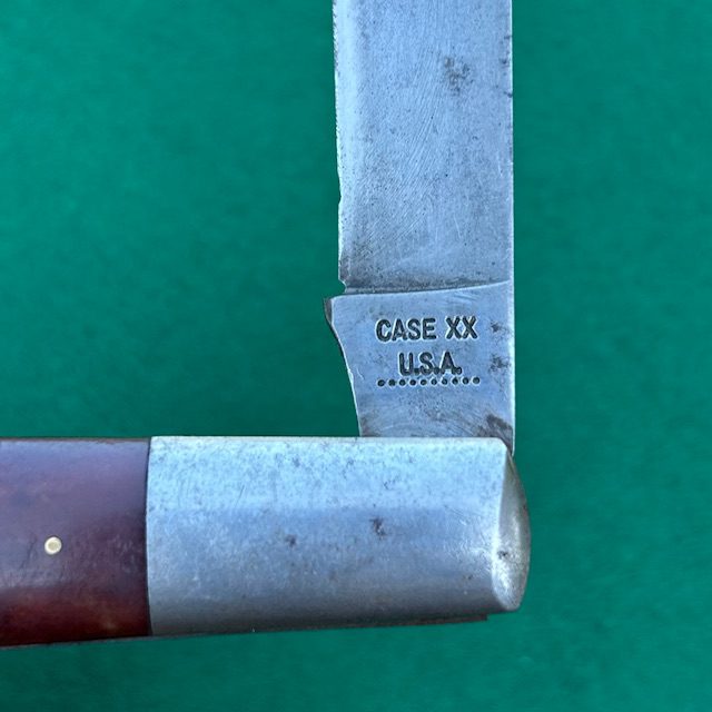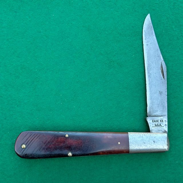 **SOLD** Up for sale is a Case XX USA 1970 6143 Daddy Barlow with beautiful red sawcut bone handles. This knife measures 5″ closed and the blade has half stops and good snap. Steel bolsters, liners and brass pins on this knife. Very nice looking knife for the collection.