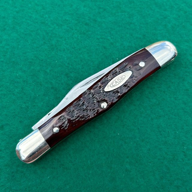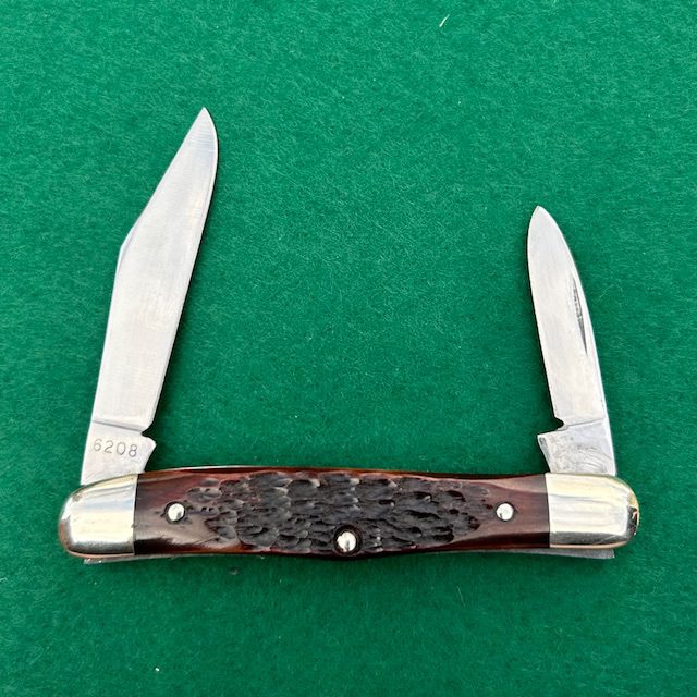 **SOLD** Here is a very nice Case XX USA 6208 half whittler with dark reddish jigged bone handles. This knife measures 3 1/4″ closed. Nickel silver bolsters and liners. Blades have great snap. Master blade appears to have been lightly cleaned. A great knife with wonderful handles!