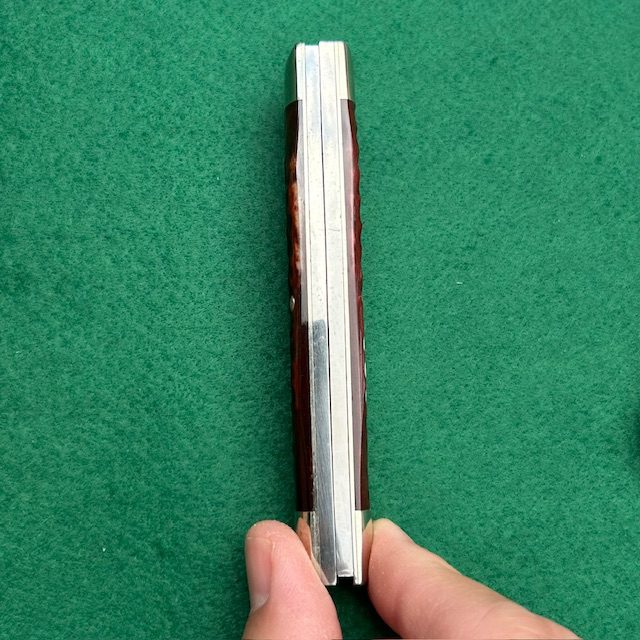 **SOLD** This is such a clean knife! Up for sale is a vintage 1975 Case XX Moose 6275 SP knife with jigged reddish bone handles. I made a YouTube video featuring this knife. The handles are in wonderful condition and the mirror polished blades are as well. Blades have good snap. This knife measures 4 1/4″ closed. Nickel silver bolsters, liners and pins. This one won’t last. What a great addition to your collection!