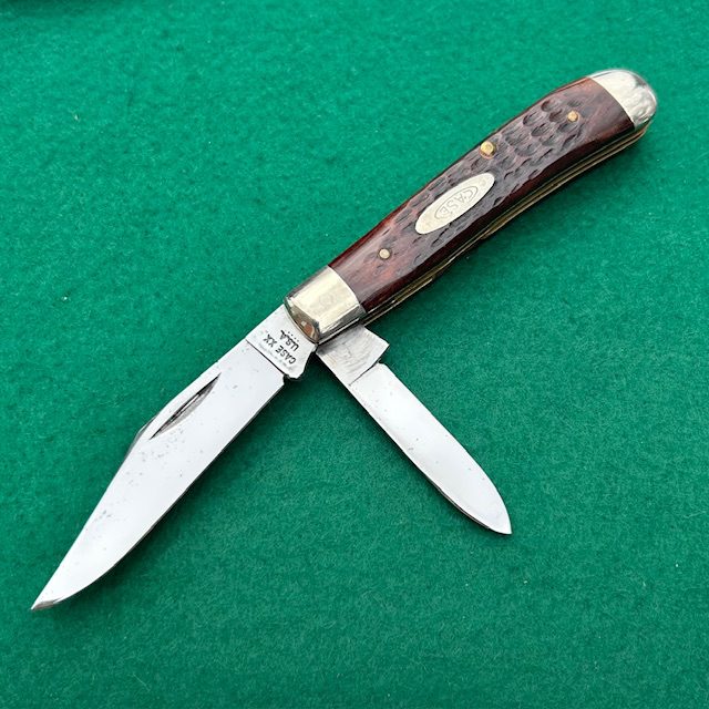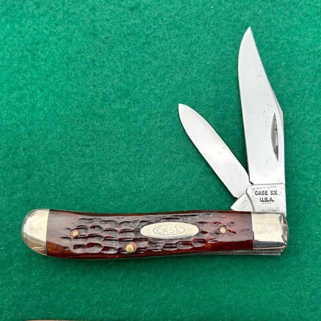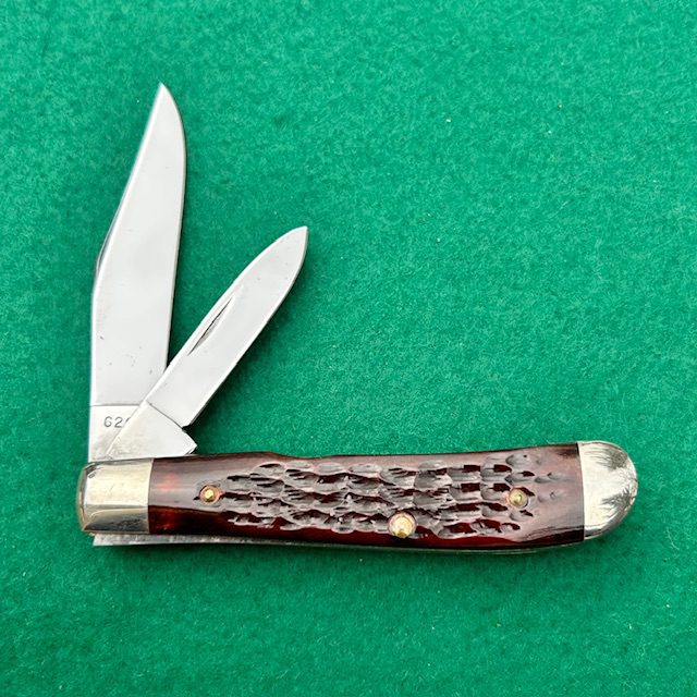 **SOLD** Here is a Case XX USA 6207 Mini Trapper made in 1976. The reddish jigged bone handles on this knife make it really special! The blades have their factory edge, half stops and good snap. Nickel silver bolsters and brass liners. The blades show a carbon spot or two as seen in the pictures but overall great shape. The knife measures just short of 3 1/2″ closed. These reddish bone handles are getting harder to find!