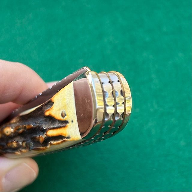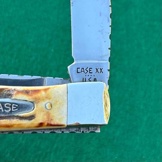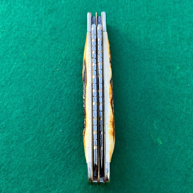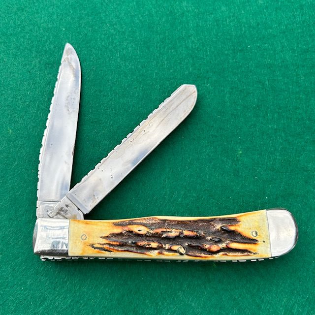 Here is a custom Case 1986 stag Trapper with beautiful filework on the blades and backsprings. Measures 4 1/8″ closed. Very nice genuine stag handles. Blades have good snap and show some tarnish on the carbon steel blades. Overall in really nice shape. Lots of work went into this knife…add this one to your collection!
