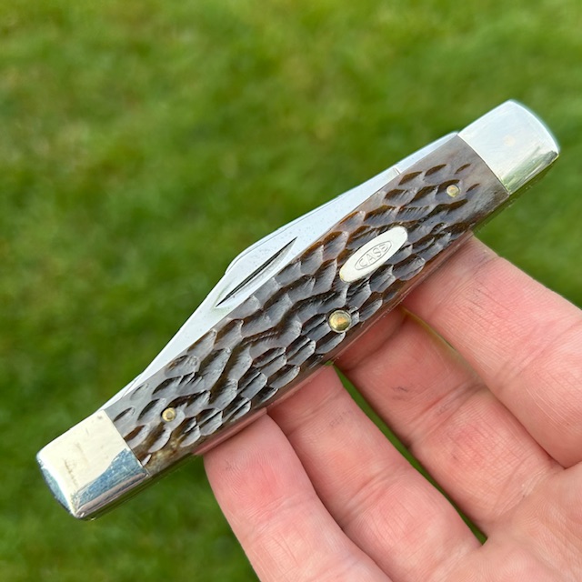 **SOLD** Up for sale is a Case XX USA 6375 large Stockman with jigged bone handles. Measures 4 1/4″ closed. This knife was made in 1986 and features 4 dots on the blade with the “lightning s” stamp. Blades have factory edge and retain their mirror polished finish. Nickel silver bolsters and Case shield with brass liners and pins. A great looking knife for your collection!