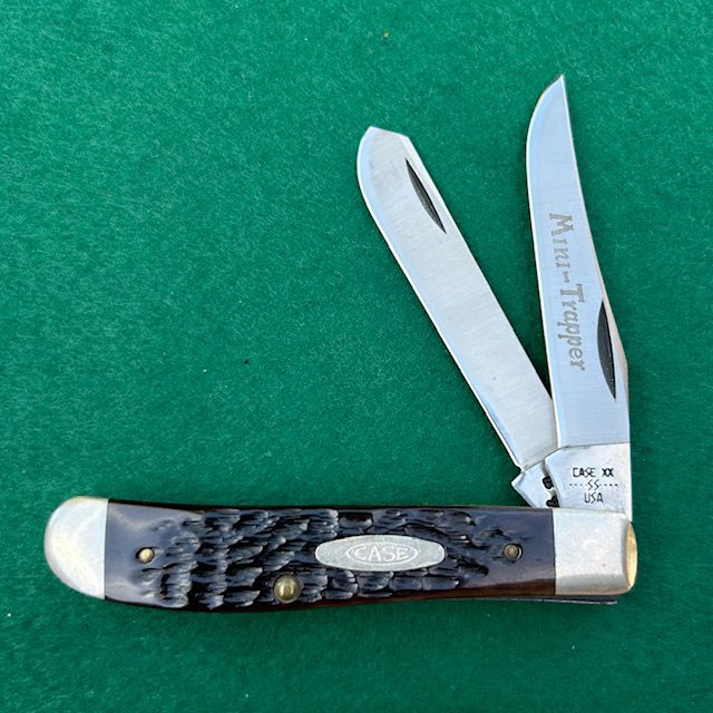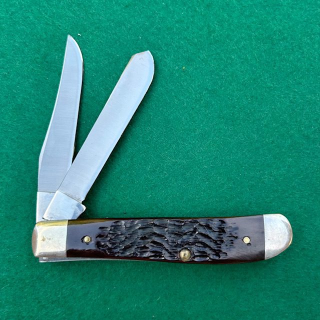 Here is a very nice Case XX USA Mini Trapper with bone handles made in 1982. Blades appear unused have half stops and good snap when closing. Nickel silver bolsters and brass liners. Clip blade is etched “Mini Trapper”. This knife measures 3 1/2″ closed. A very nice knife!