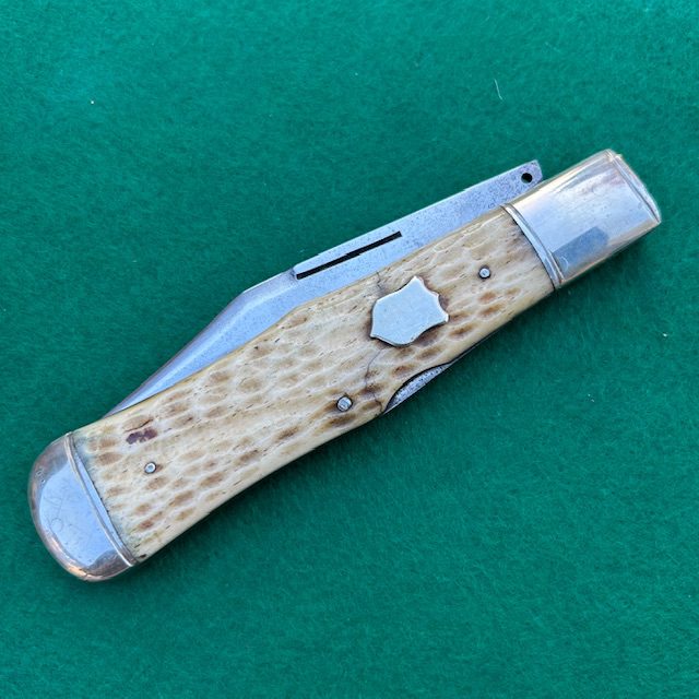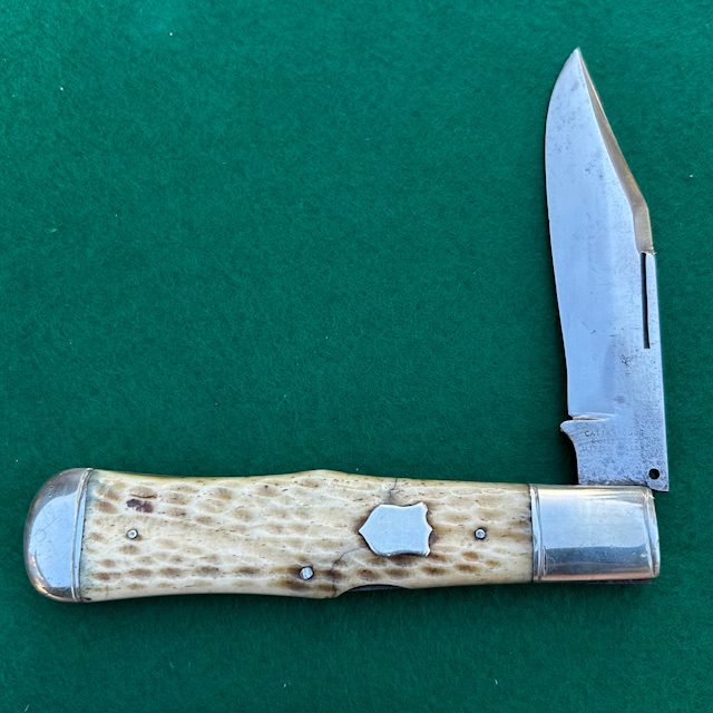 Here is an early “King of the Woods” coke bottle folding hunter pattern made by Cattaraugus Cut Co. This pattern features a locking mechanism that functions as it should. This knife features “worm grooved” jigged bone handles, nickel silver bolsters and federal style shield. This knife is missing its swing guard but is still a really nice example. Front handle has a stable hairline crack on either side of the shield. The knife measures 5 1/4″ closed. A bit of blade wobble when in open position. A really neat old knife!