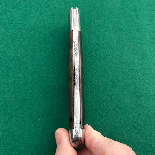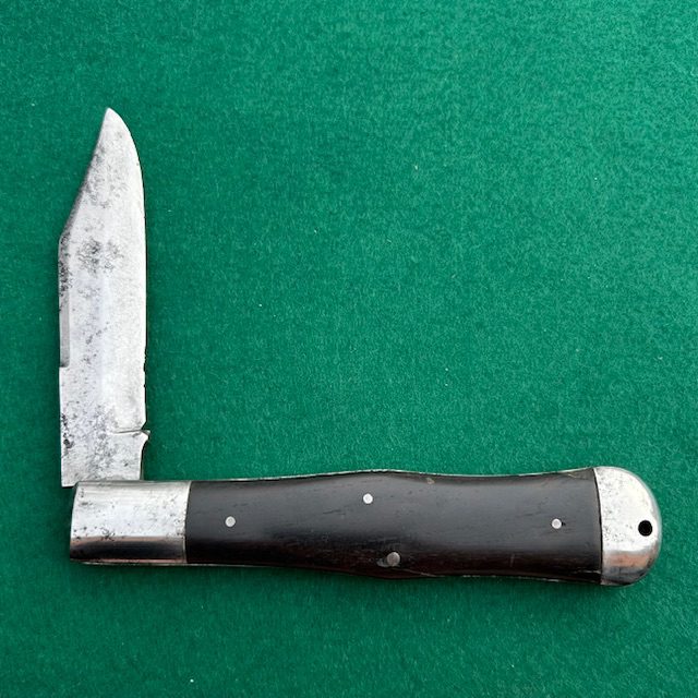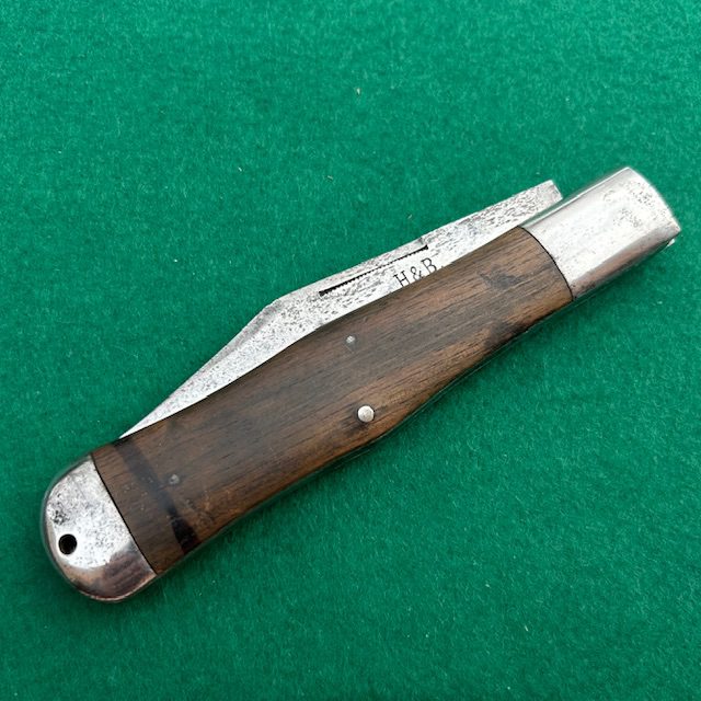 **SOLD** Here is an old coke bottle folding hunter with wood handles. The saber ground blade is stamped H & B Mfg. Co New Britain, Conn. This knife measures 5 1/2″ closed and the blade has good snap, half stops and no wobble when open. Blade shows use and pitting as seen in the pictures. Wood handles are darker on the back side but both are original to the knife. Very neat old pattern!
