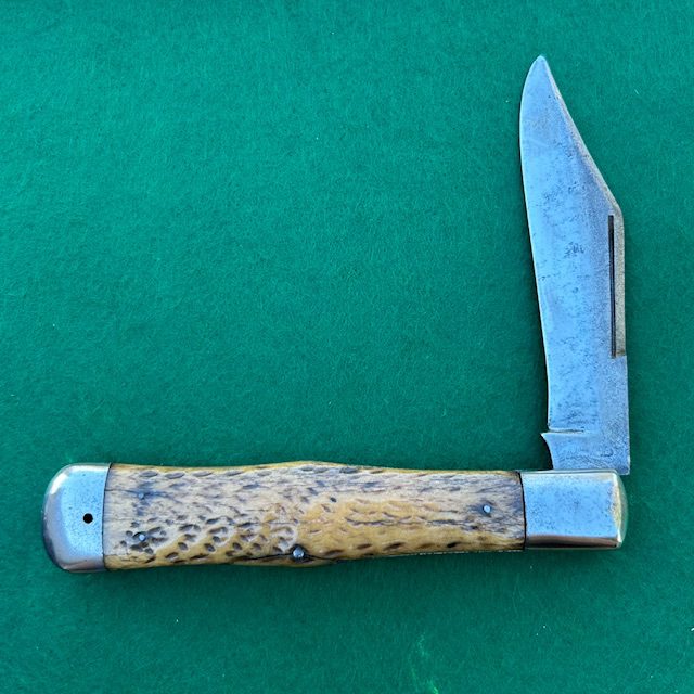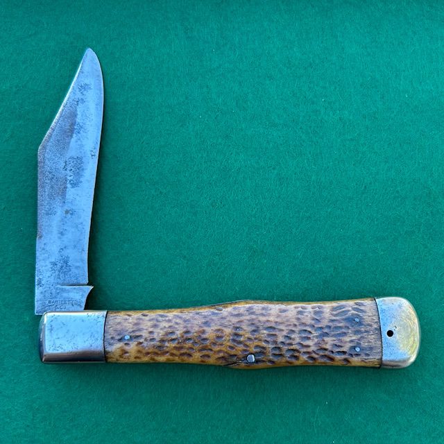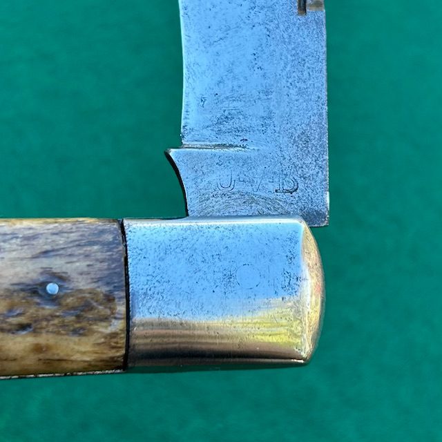 Here is a large coke bottle folding hunter made by Hibbard, Spencer, Bartlett & Co. Large knife measures 5 1/2″ closed. Blade has half stop, strong snap upon opening all the way but slow upon closing. Tang is stamped OVB (Our Very Best) on the front and Hibbard, Spencer, Bartlett & Co on the back. Jigged bone handles have stress cracks at the center pin on both sides as seen in the pictures. Neat old knife!