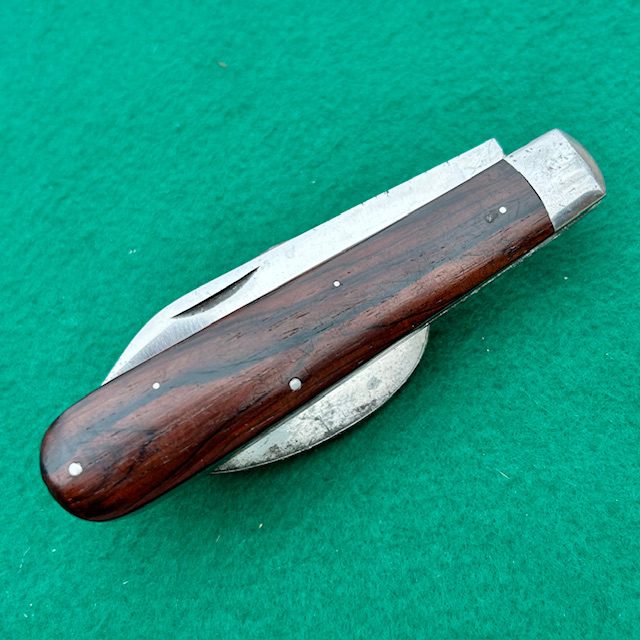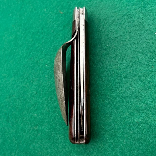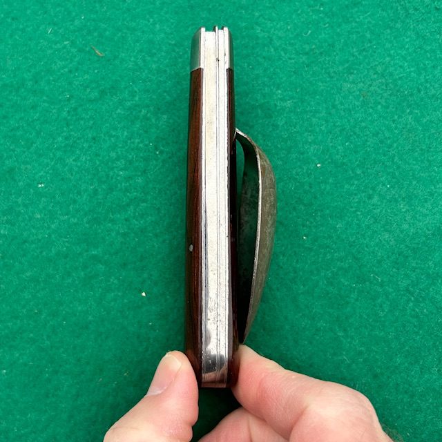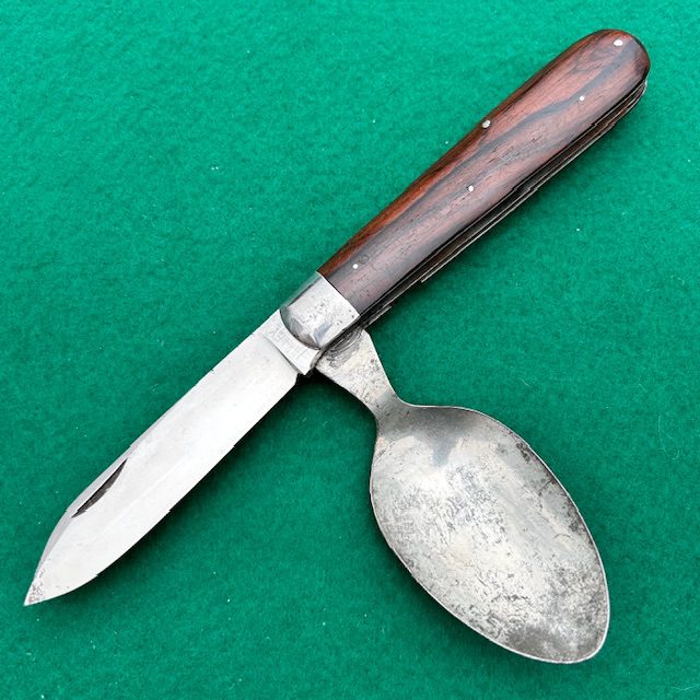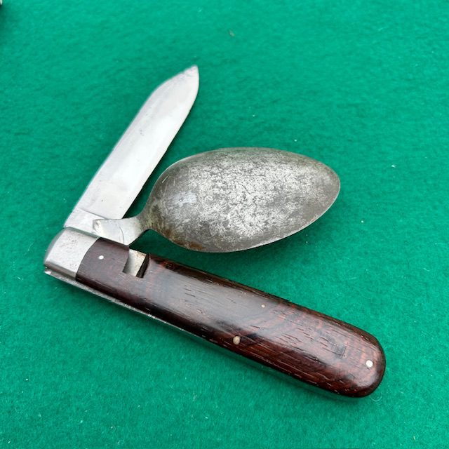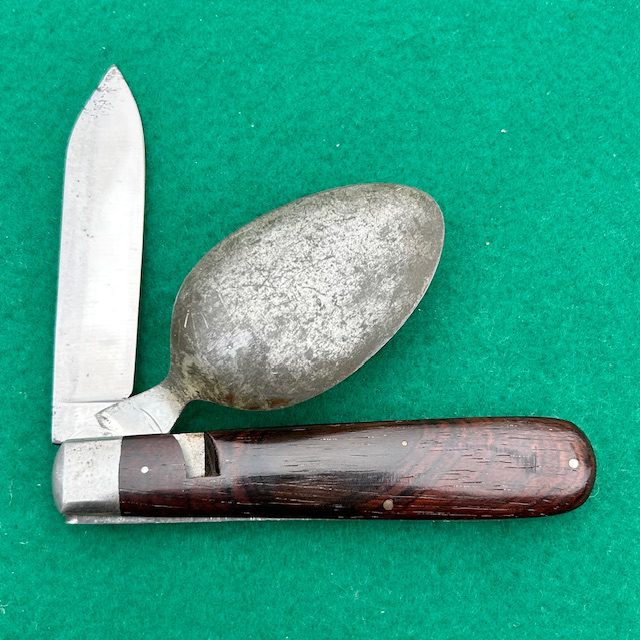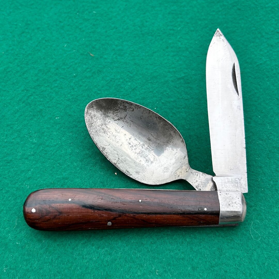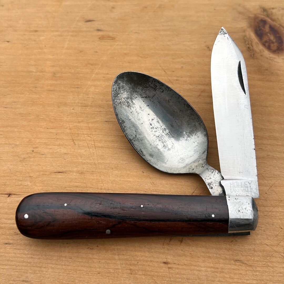 **SOLD** Here is an extremely nice Holley Lakeville Conn “hobo” or “Red Cross” knife with beautiful wood handles.  These knives were made for the Red Cross who would ship them in kits overseas to troops who were stationed in Europe during the WWI (c. 1917 – 18).  The spear point blade shows no signs of being used, maintaining its factory edge and polish just as it did when it left the factory.  Has a half stops and good snap when closing.  There is a bit of tarnish at the top of the blade. The spoon, made out of a different metal, shows expected tarnish as seen in the pictures.  This knife is in remarkable shape and has a wonderful connection to “The Great War” and US history.
