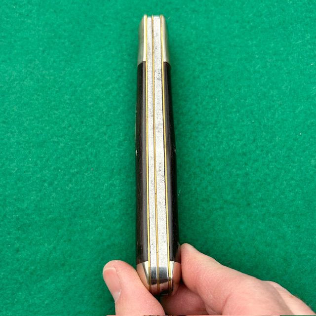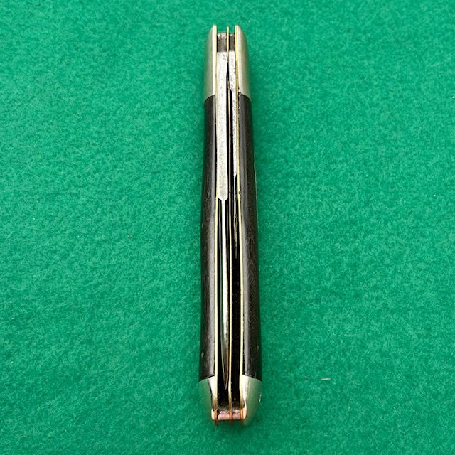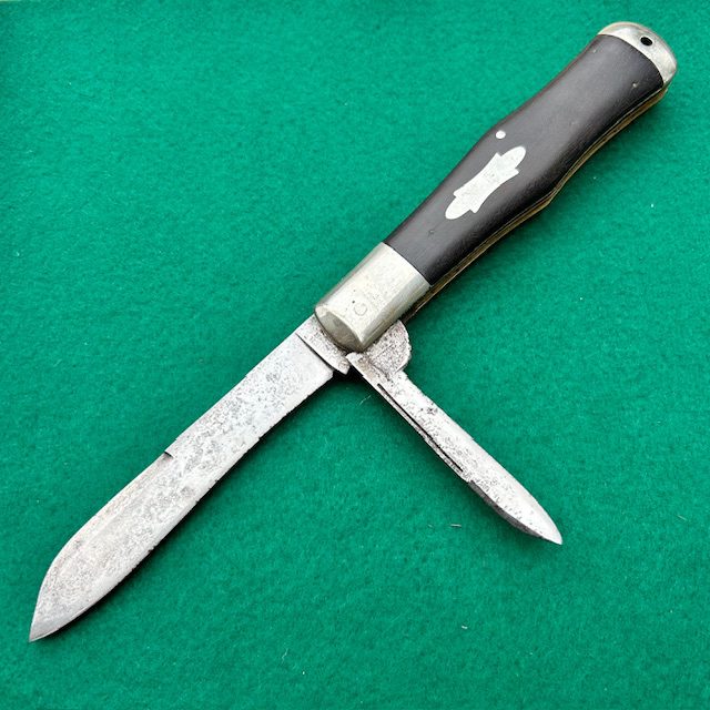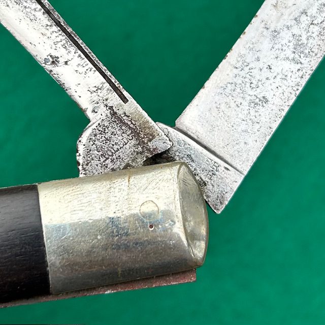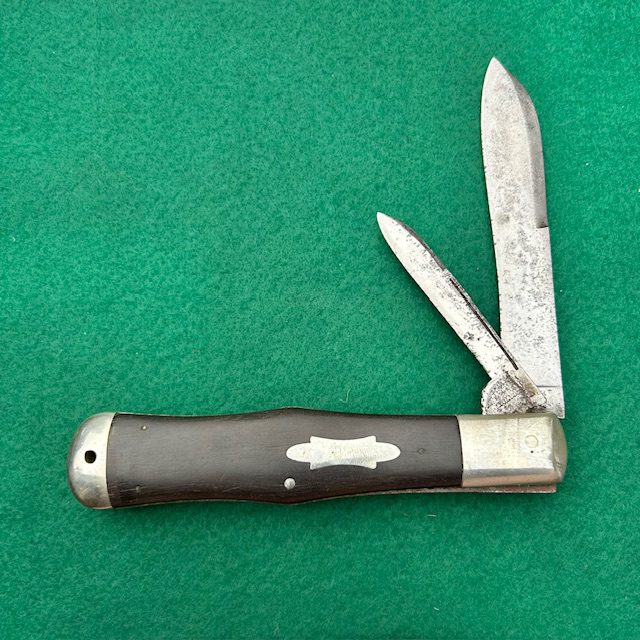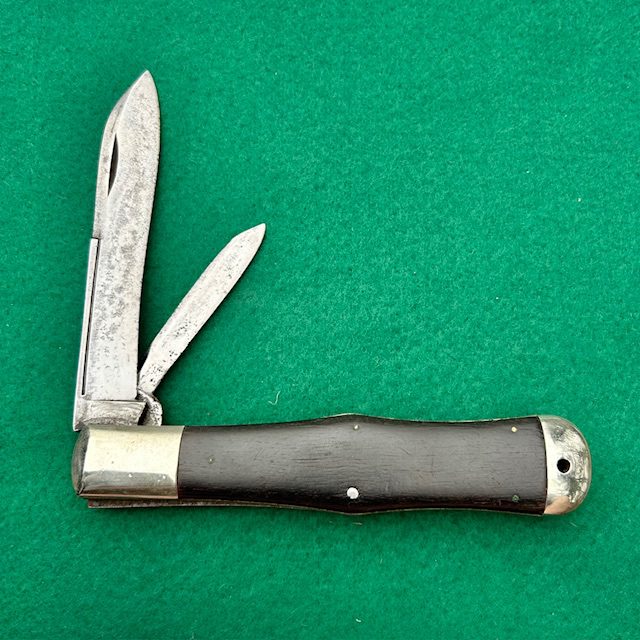 Rare pattern! Large folding hunter coke bottle pattern with spear blade and pen blade. The knife measures nearly 5 1/2″ closed. This Maher & Grosh knife (both blades stamped) was made by Miller Brothers out of Connecticut. Both blades have half stops and good snap. The blades show wear and pitting as seen in the pictures. The blades were cleaned at some point. Ebony wood handles are in great shape. This pattern is rarely seen!