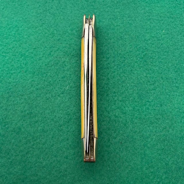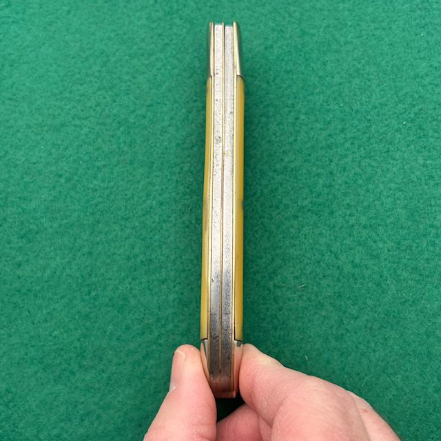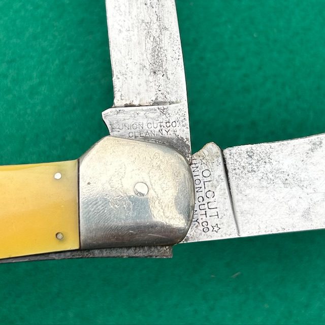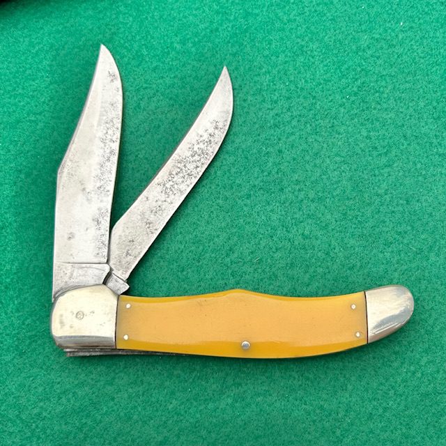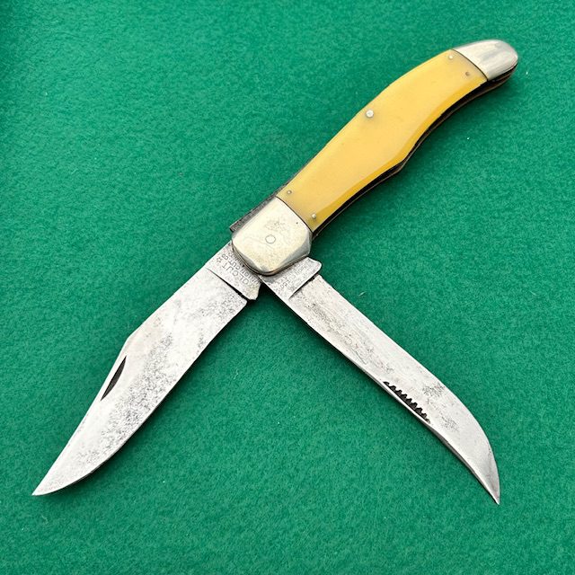 Up for sale is a an Olcut Union Cutlery Co Olean NY large folding hunter with nice yellow handles. This knife measures 5 1/4″ closed. Both blades have good snap. The skinner blade is a tad bent and sits next to the main blade when closed but I’m sure this can be easily adjusted. Very neat old KA-BAR family knife for the collection.
