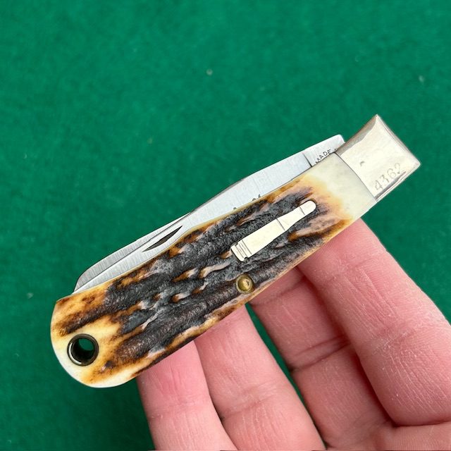 **SOLD** Here is a beautiful Remington Baby Bullet, model 1176, made by Camillus in 1994. This is number 4362 out of 5000 produced. Wonderful genuine stag handles. Blades have half stops, good snap and have do not show any use. Nickel silver bolsters, bullet shield and brass liners. Comes with the original box. What a great looking knife!