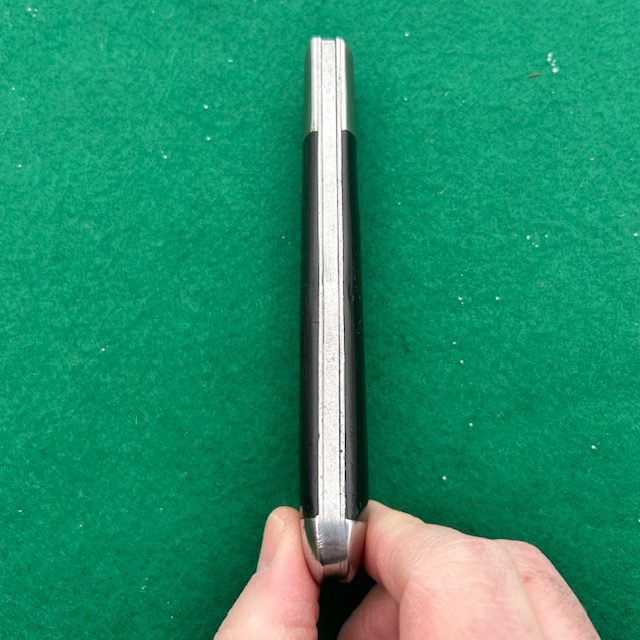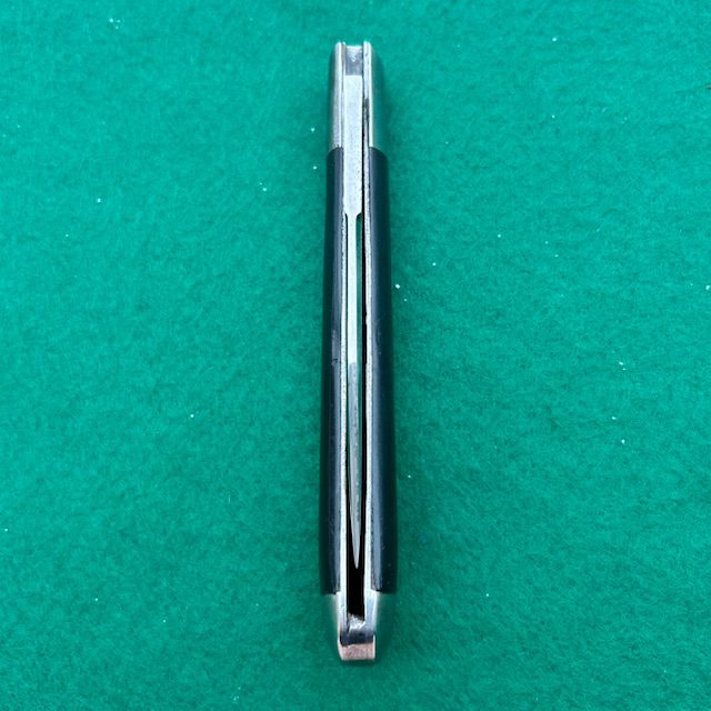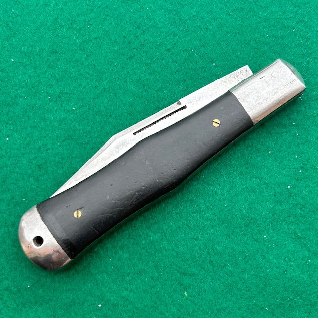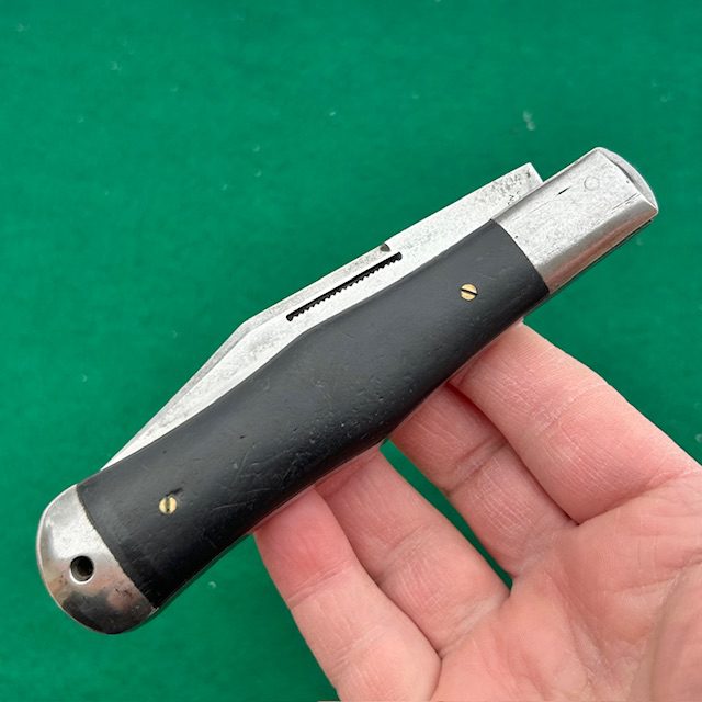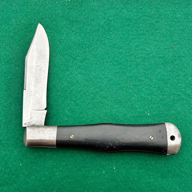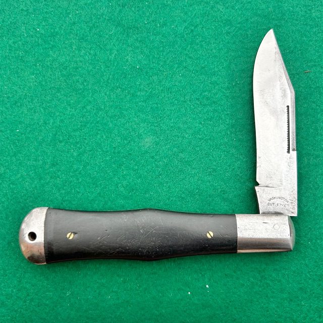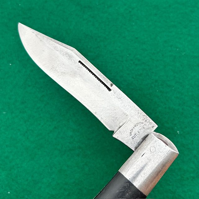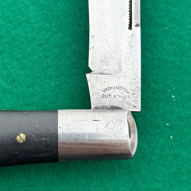 Up for sale is a rare Washington Cutlery Co coke bottle folding hunter with ebony wood handles. The handles are attached to the liners via screws which is an indicator that this knife was made by Miller Brothers Cutlery Co out of Meriden, Conn. The main blade has very strong snap, a half stop and a match striker pull. The knife measures nearly 5 1/2″ closed. A very neat knife for your collection!