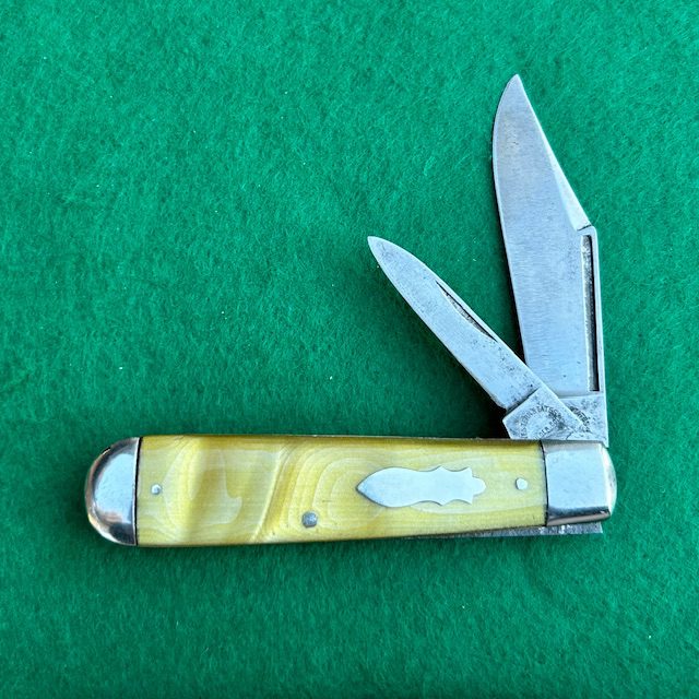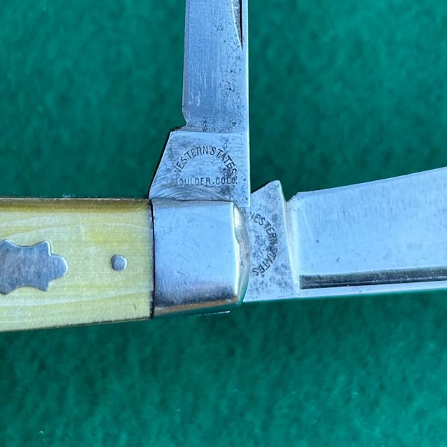 Here is a very nice Western States (c.1911 – 1940s) jack knife with green pyralin handles. Both blades have the arched Western States stamp and have very strong snap (so tight the pen blade is hard to open) and half stops. This knife measures 3 1/2″ closed. Brass liners and nickel silver bolsters. The knife has been cleaned at some time in the past.